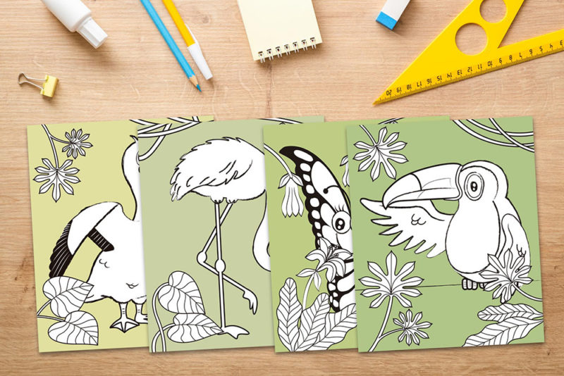 Animales de las láminas: Pelícano, flamenco, mariposa, tucán