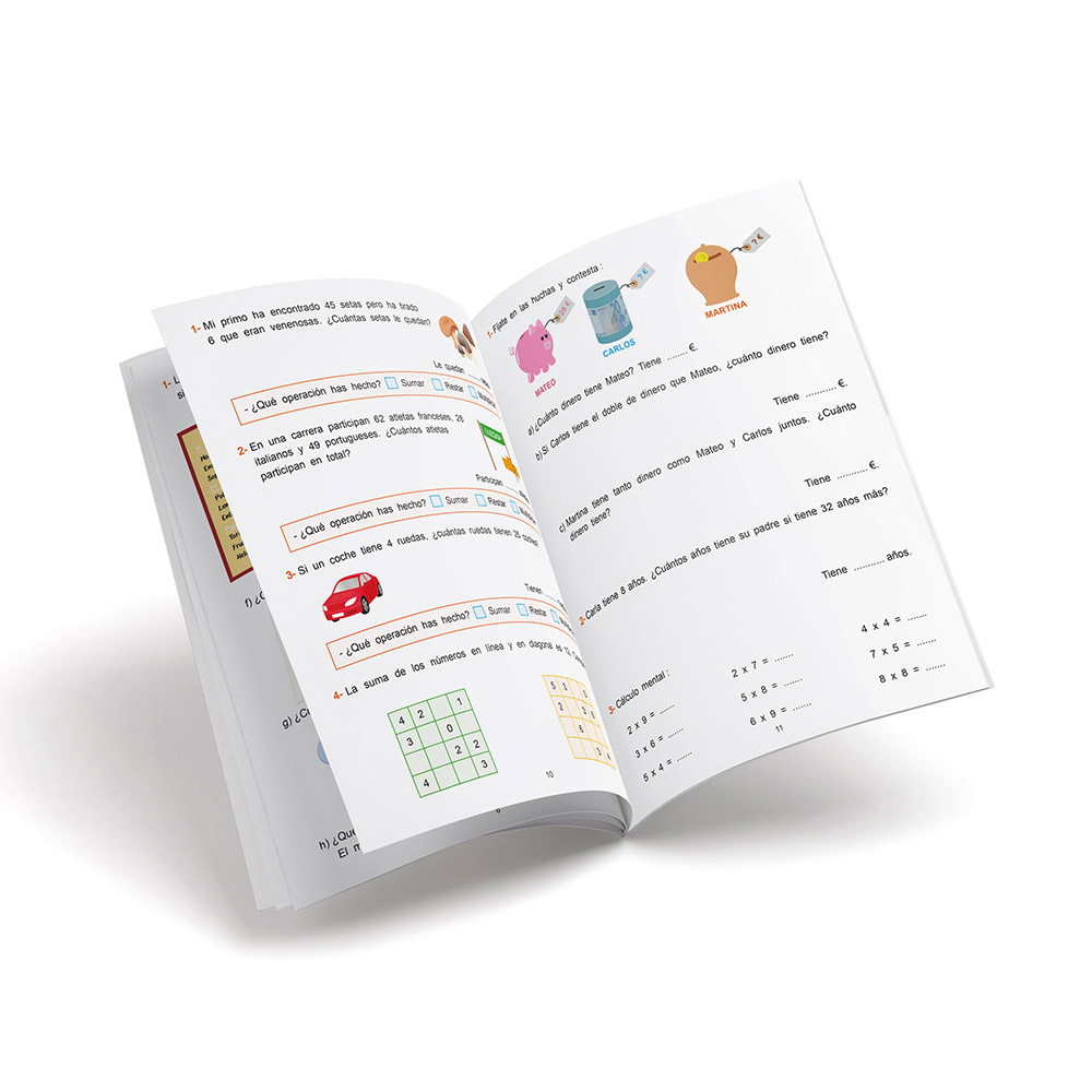 Los cuadernos trabajan problemas que los niños y las niñas se pueden encontrar en la vida diaria. Empezamos por cuadernos con la suma, suma llevándose, resta, resta llevándose, multiplicación por una cifra, por más y la división por una cifra y por varias cifras.